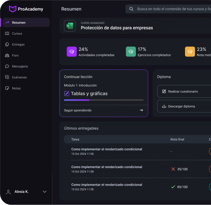 ProAcademy, nuestra plataforma LMS, es una solución digital diseñada para facilitar el acceso a los cursos en formato online. Esta plataforma permite a todo tipo de empresas gestionar y acceder a recursos educativos como cursos, contenido multimedia, evaluaciones, seguimiento del aprendizaje… Nuestra plataforma está diseñada para formación interna, Academias, Centros Educativos, Onboarding, Escuelas de Negocio y todo tipo de empresas que necesiten un sistema LMS para gestionar sus formaciones.